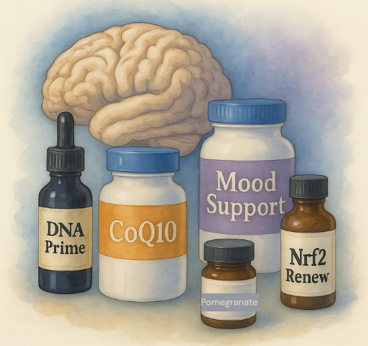 These five supplements form a coherent support strategy for total system vitality. DNA Prime and CoQ10 reinforce the cellular and mitochondrial infrastructure. DHH-B Mood Support restores nervous system balance to prevent stress from interfering with energy and hormone pathways. Pomegranate Complete strengthens antioxidant and vascular systems, while Nrf2 Renew activates the genetic mechanisms of detoxification and repair.
